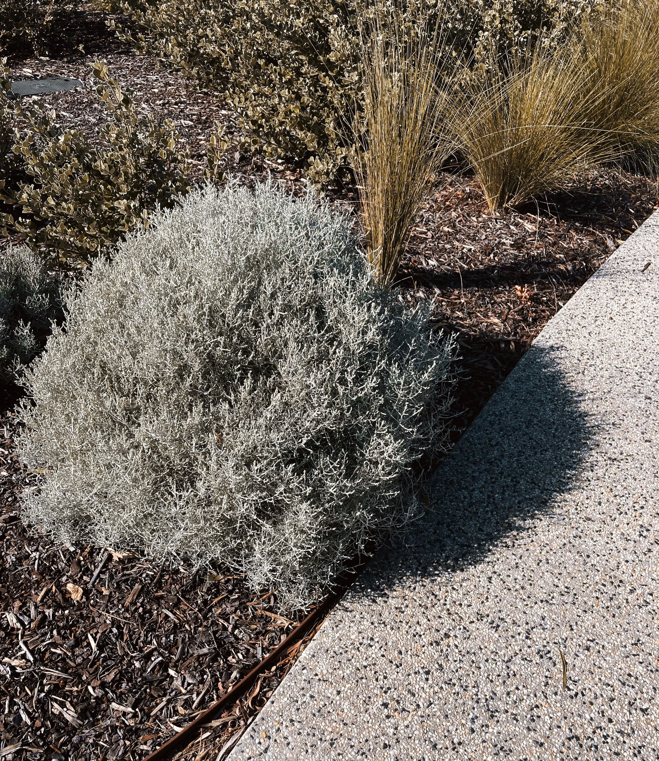 The planting strategy reinforces the coastal context, combining structured screening with lower understorey species, while material selections—including exposed aggregate concrete, timber sleepers and gravel—respond to durability and constructability constraints.