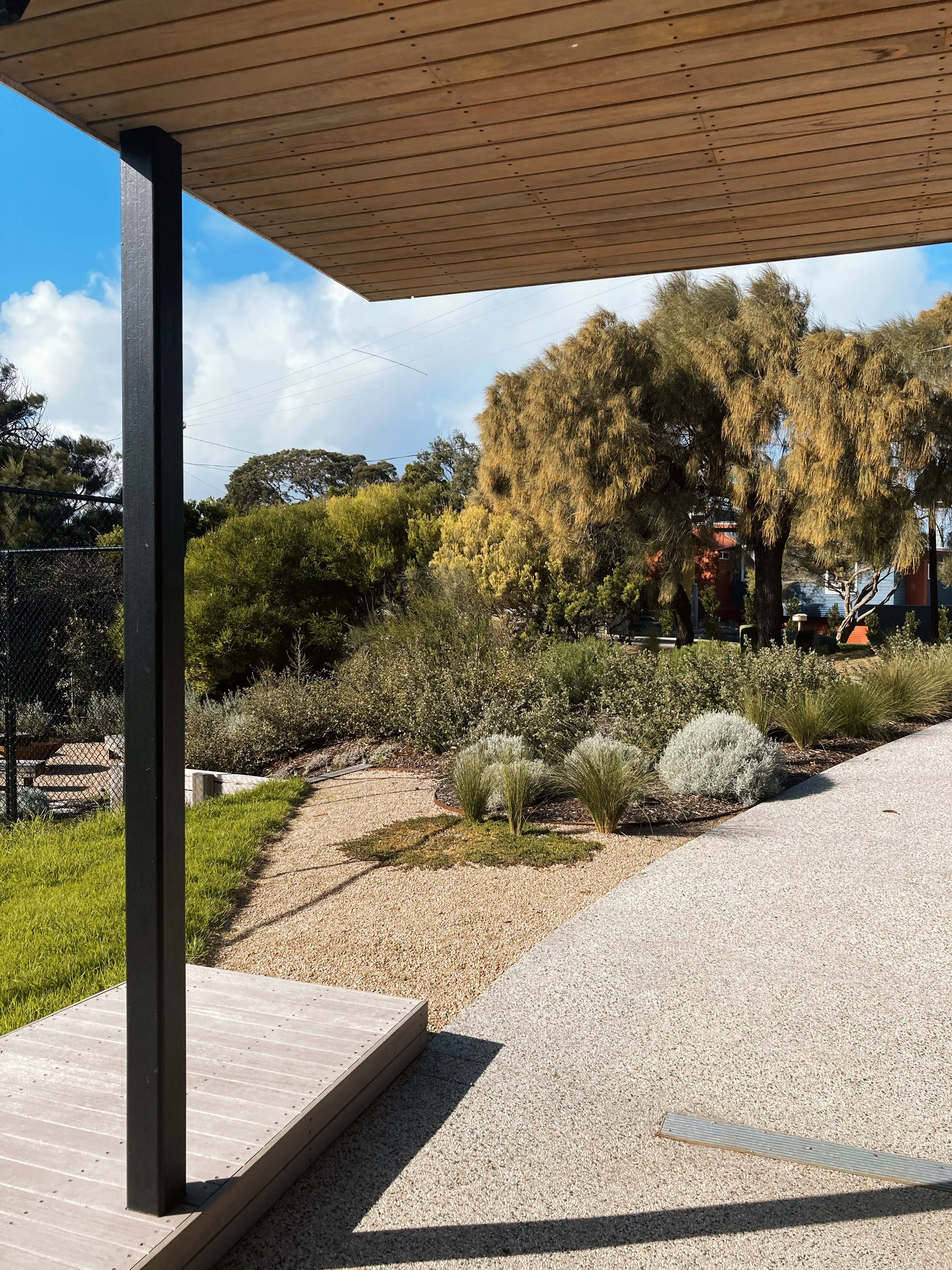 Located on a 1300sqm suburban coastal allotment in Blairgowrie, this project resolves a complex sloping site through a series of terraced landscape elements anchored by a retained and refurbished tennis court. The court sits at the upper portion of the site and is integrated with the dwelling via broad hardwood timber stairs and a sequence of sleeper retaining walls, which manage level transitions and define circulation routes.