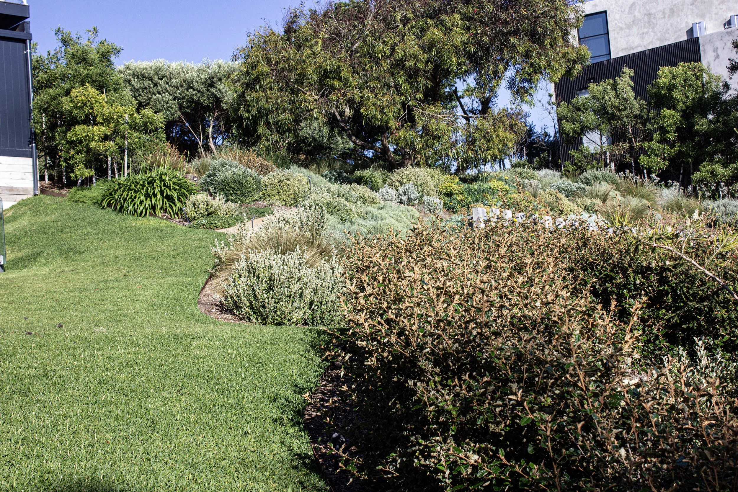 A strong ecological framework underpins the scheme, with existing coastal vegetation retained and supplemented by indigenous species including Moonah, Coastal Banksia and Drooping She-oak. This layered planting approach reinforces local habitat character while providing privacy and wind protection typical of the Portsea environment .