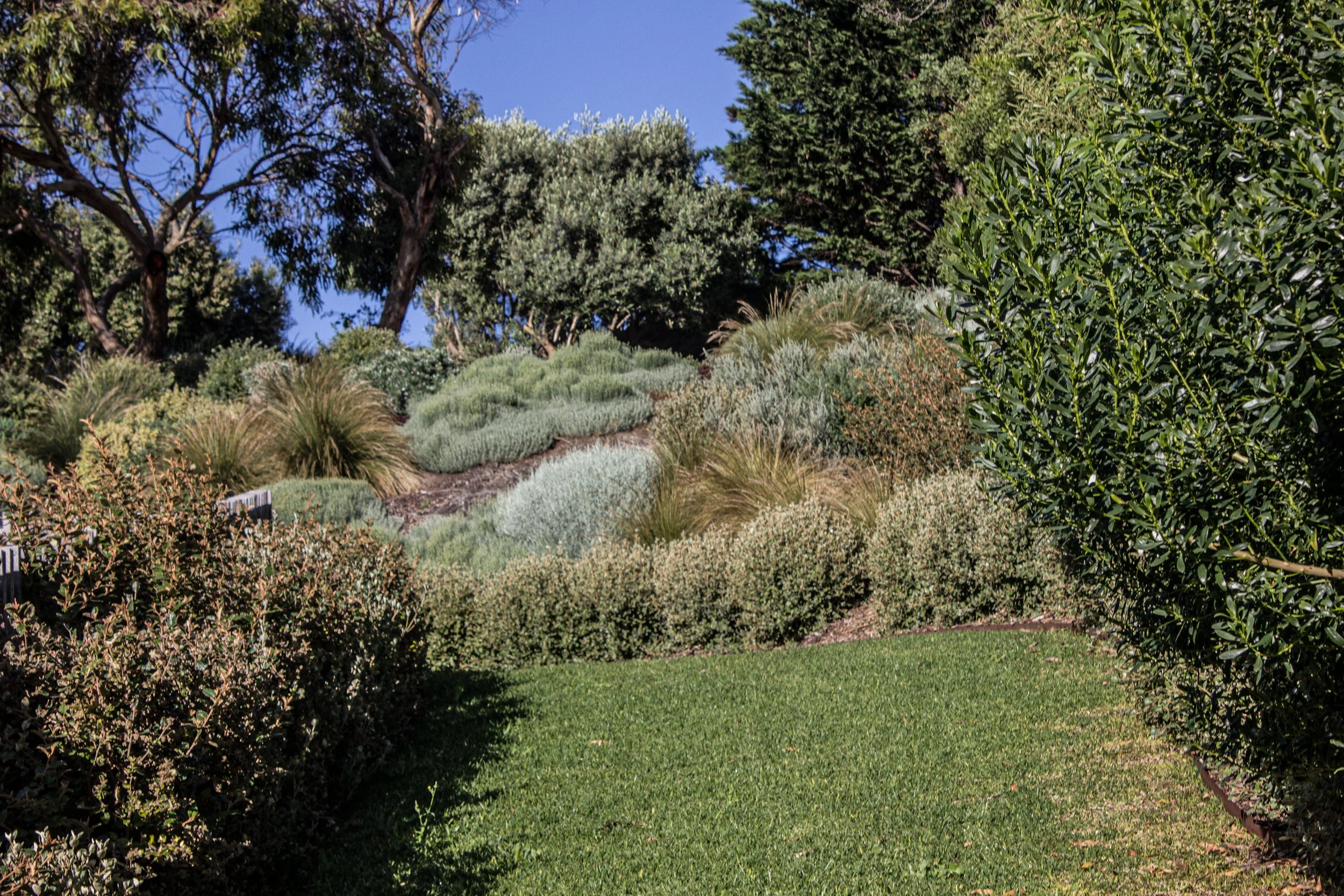 Set within the coastal landscape of Portsea on Victoria’s Mornington Peninsula, this project transforms a steeply sloping sand dune site into a series of connected outdoor rooms that balance recreation, ecology and retreat. The design carefully negotiates significant level changes, using retaining walls and terraced landforms to embed a full-sized tennis court into the terrain while maintaining a cohesive garden setting .